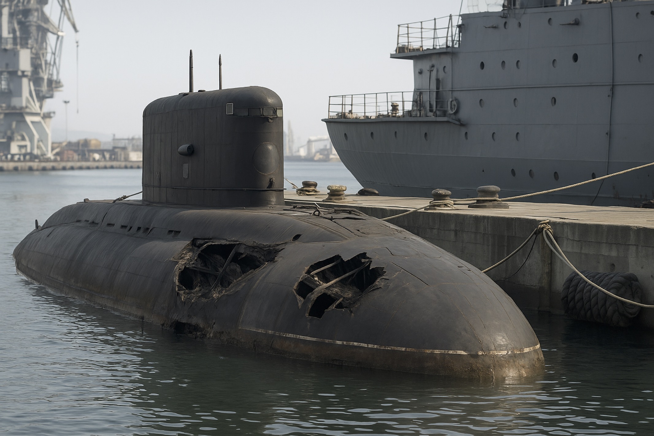 - Satellite imagery showing wreckage or absence of submarine at the dock;